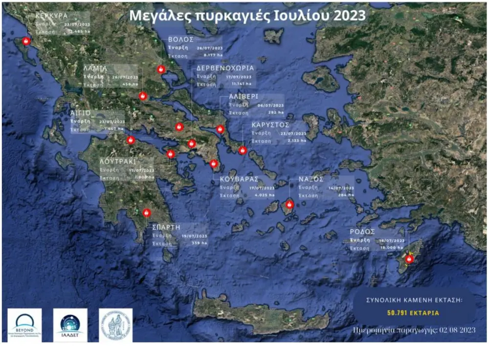 H Επιχειρησιακή Μονάδα BEYOND του Ινστιτούτου Αστρονομίας, Αστροφυσικής, Διαστημικών Εφαρμογών & Τηλεπισκόπησης (ΙΑΑΔΕΤ) του Εθνικού Αστεροσκοπείου Αθηνών (ΕΑΑ) κατέγραψε λεπτομερώς τις καμένες εκτάσεις που οφείλονται στις σημαντικότερες πυρκαγιές που συνέβησαν στη χώρα μέχρι και τις 2 Αυγούστου 2023. Με βάση τον απολογισμό εκτιμάται ότι τον Ιούλιο 2023 έχουν καεί εκτάσεις της τάξης των 507.910 στρεμμάτων, με το νησί της Ρόδου μόνο, να μετρά 180.000 καμένα στρέμματα, ενώ μεγάλο πλήγμα δέχτηκαν επίσης η Δυτική Αττική αλλά και η Μαγνησία.