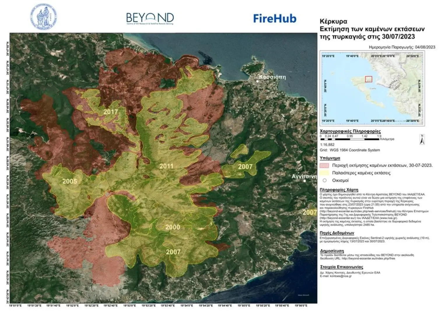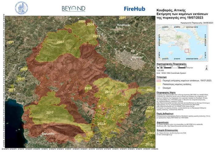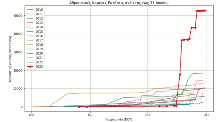 Με βάση τα δεδομένα που είχε συλλέξει μέχρι και τις 31/07/2023 το Σύστημα Δορυφορικής Τηλεπισκόπησης Διαχείρισης Δασικών Πυρκαγιών FireHUB της Επιχειρησιακής Μονάδας BEYOND και το Ευρωπαϊκό Σύστημα Πληροφοριών για Δασικές Πυρκαγιές (EFFIS) (βλ. παρακάτω Πίνακα 1), και μελετώντας τις χαρτογραφημένες καμένες εκτάσεις, προέκυψε ότι οι πρόσφατες δασικές πυρκαγιές έχουν προκαλέσει σημαντικά μεγαλύτερη καταστροφή από κάθε αντίστοιχη περίοδο τα τελευταία 13 χρόνια.