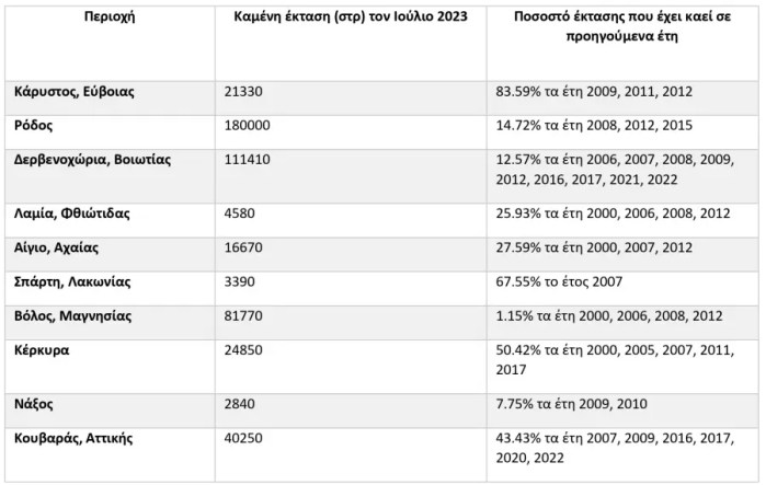 Στον παρακάτω Πίνακα 2 φαίνονται αναλυτικά οι εκτάσεις των πυρκαγιών του Ιουλίου 2023 που έχουν πληγεί σε παλαιότερες πυρκαγιές.