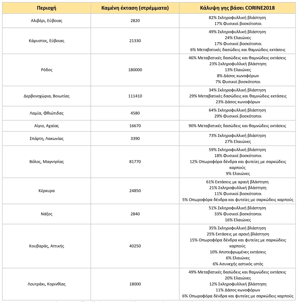 Σχετικά με τα είδη εκτάσεων που έχουν πληγεί, η ανάλυσή με το Corine Land Cover 2018 έδειξε ότι από τα 507.910 στρέμματα γης, το 32% ανήκει σε σκληρόφυλλη βλάστηση και το 28% σε μεταβατικές δασώδεις και θαμνώδεις εκτάσεις. Επιπλέον, με το πέρασμα της πυρκαγιάς πλήχτηκαν ελαιώνες 9% και κωνοφόρα δάση 9%, φυσικοί βοσκότοποι 7.5% και εκτάσεις με αραιή βλάστηση 6%. Αναλυτικά στοιχεία ανά γεγονός φαίνονται στον παρακάτω Πίνακα 3.
