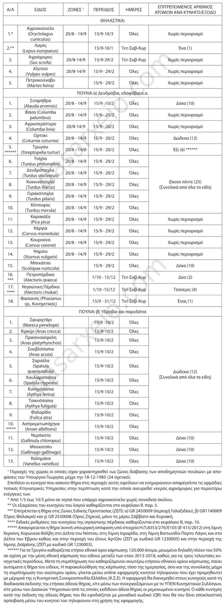 Τα επιτρεπόμενα να κυνηγηθούν είδη, η χρονική περίοδος και οι μέρες κυνηγίου τους, καθώς και ο μέγιστος αριθμός θηραμάτων κατά είδος, που επιτρέπεται να θηρεύει ο κάθε κυνηγός στην ημερήσια έξοδο του, αναφέρονται στον «ΠΙΝΑΚΑ ΘΗΡΕΥΣΙΜΩΝ ΕΙΔΩΝ» που ακολουθεί.