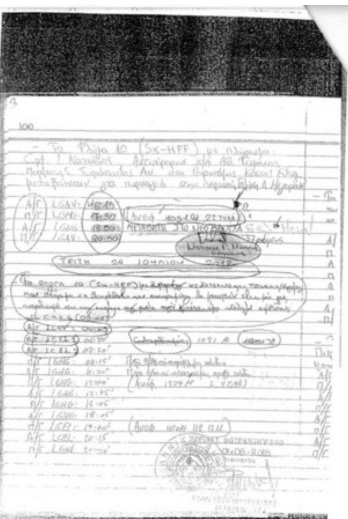 Στην συνέχεια σας παραπέμπω σε μια σελίδα αυτού του βιβλίου καταγραφής των ωρών πτήσης όπως δόθηκε στην δημοσιότητα από την Δίκη για το ΜΑΤΙ το 2018.