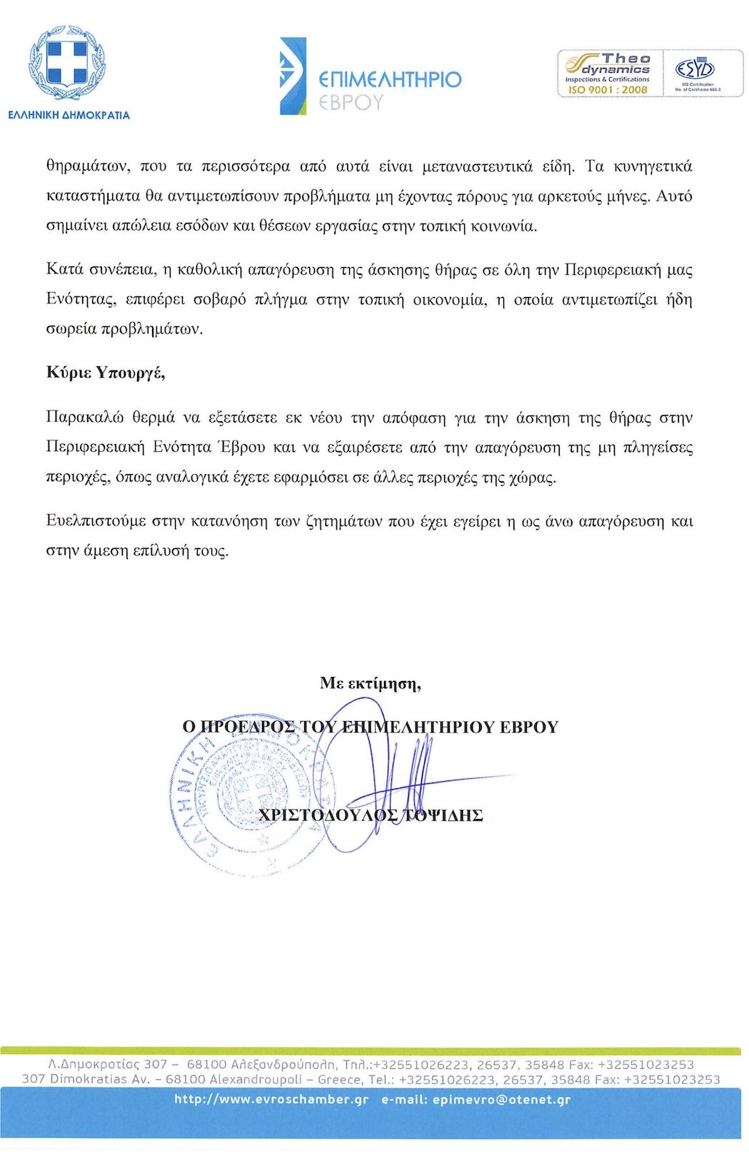 Σημειώνει δε ότι το κυνήγι, ως δραστηριότητα, ενισχύει σημαντικά την τοπική οικονομία του Έβρου (καταστήματα πώλησης σχετικών ειδών, τουριστικά καταλύματα κα) και, ως εκ τούτου, ζητά την τροποποίηση της υπουργικής απόφασης, ώστε το κυνήγι να επιτρέπεται σε περιοχές του Έβρου που δεν έχουν πληγεί, όπως έχει συμβεί και σε άλλες πυρόπληκτες περιοχές.