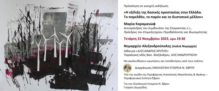 Η «OIKOΛOΓIKH ΕΤΑΙΡΕΙΑ Ν.ΕΒΡOΥ», υπό την αιγίδα της Περιφέρειας Ανατολικής Μακεδονίας και Θράκης – Περιφερειακή Ενότητα Έβρου, διοργανώνει ανοιχτή εκδήλωση με προσκεκλημένη την κ. Μαρία Καραμανώφ, Αντιπρόεδρο του Συμβουλίου της Επικρατείας ε.τ., Πρόεδρο του Επιμελητηρίου Περιβάλλοντος και Βιωσιμότητας, την Τετάρτη 22 Νοεμβρίου, ώρα 19:30, στην αίθουσα «ΑΛΕΞΑΝΔΡΟΣ ΚΡΗΤΗΣ» του Νομαρχείου Αλεξανδρούπολης (παλιά Νομαρχία), στην παραλιακή οδό Βασ. Αλεξάνδρου.