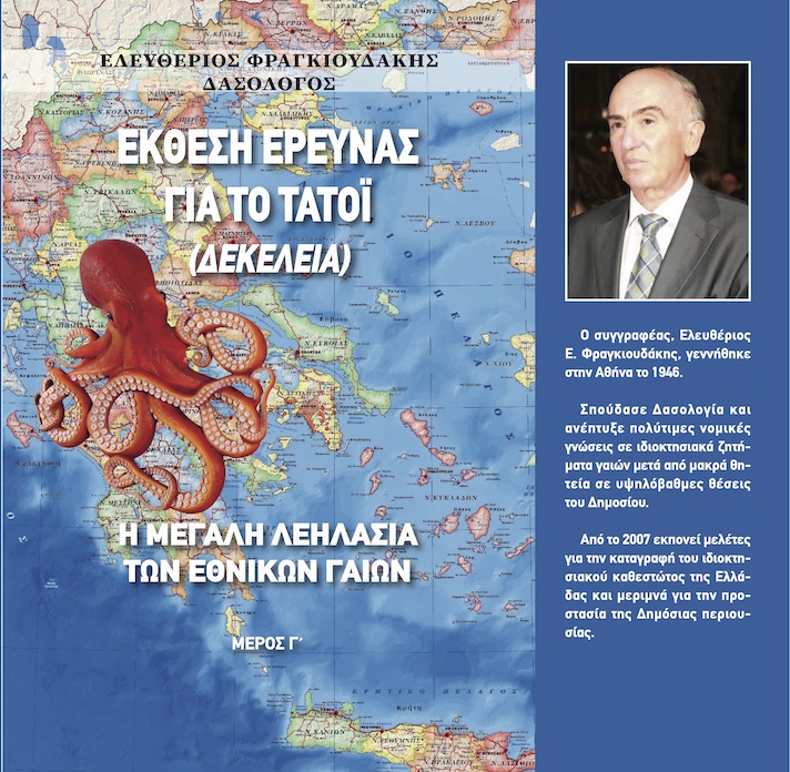 Απέναντι σε όλα αυτά, η μελέτη αναλύει και τον ρόλο του επίσημου ελληνικού κράτους ως απλού παρατηρητή. Ο συγγραφέας πραγματεύεται ακόμα τον τρόπο με τον οποίο, σταδιακά, μεθοδεύτηκε και συντελέστηκε η δόλια αρπαγή της εθνικής περιουσίας στη χώρα μας, η οποία ανήκει σε όλους τους Έλληνες πολίτες, χωρίς καμία εναρμόνιση με τους όρους της Συνθήκης του 1835 για την προστασία της. Επίσης καταδεικνύει πώς η εκποίηση της εθνικής γης συνιστά, ταυτόχρονα, και απώλεια περιβαλλοντικού αλλά και πολιτιστικού κεφαλαίου.