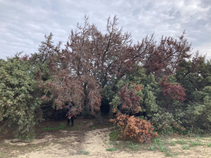 Το καλοκαίρι του 2020 άρχισαν να γίνονται εμφανή τα συμπτώματα προσβολής στα δένδρα, με τον αρχικό μεταχρωματισμό τους από πράσινα σε κόκκινο-καφέ ως την τελική ξήρανση.