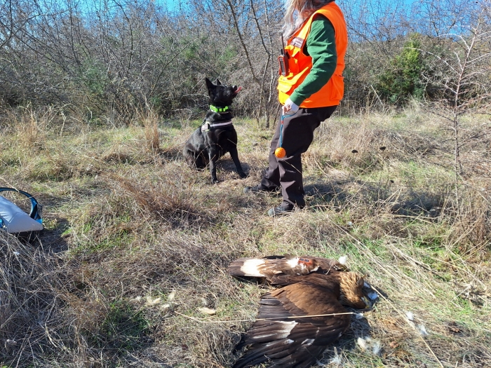 Ο νεκρός χρυσαετός που εντοπίστηκε από τον ειδικά εκπαιδευμένο σκύλο Μπόρα της Μονάδας Διαχείρισης Προστατευόμενων Περιοχών Κεντρικής Μακεδονίας με τη χειρίστριά του στην ευρύτερη περιοχή του Λαγκαδά ©Elisabeth Navarrete