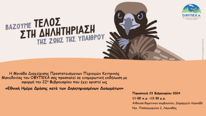 Η Μονάδα Διαχείρισης Προστατευόμενων Περιοχών Κεντρικής Μακεδονίας του Οργανισμού Φυσικού Περιβάλλοντος και Κλιματικής Αλλαγής (ΟΦΥΠΕΚΑ) σας προσκαλεί σε ενημερωτική εκδήλωση στον Λαγκαδά, με αφορμή την 22α Φεβρουαρίου, η οποία έχει οριστεί ως «Εθνική Ημέρα Δράσης κατά των Δηλητηριασμένων Δολωμάτων». Η εκδήλωση θα πραγματοποιηθεί την Παρασκευή 23 Φεβρουρίου 2024, στις 11 το πρωί, στην αίθουσα δημοτικού συμβουλίου του Δημαρχείου Λαγκαδά.