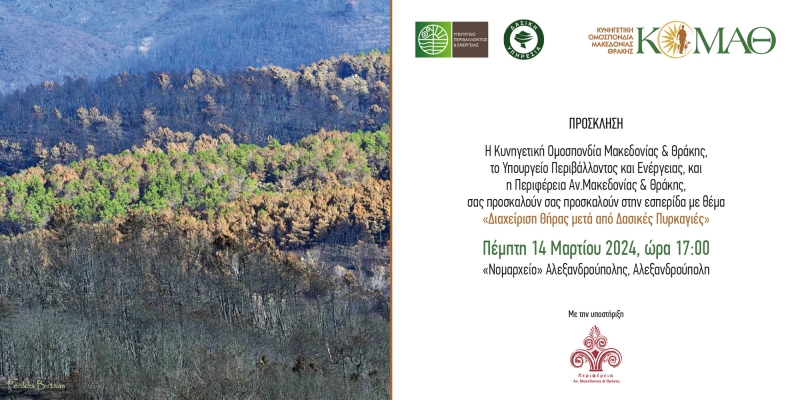 Η Κυνηγετική Ομοσπονδία Μακεδονίας και Θράκης (ΚΟΜΑΘ), υπό την αιγίδα του Υπουργείου Περιβάλλοντος και Ενέργειας και με την υποστήριξη της Περιφέρειας Ανατολικής Μακεδονίας και Θράκης, διοργανώνει ενημερωτική εκδήλωση με θέμα «Διαχείριση της Θήρας μετά από Δασικές Πυρκαγιές».