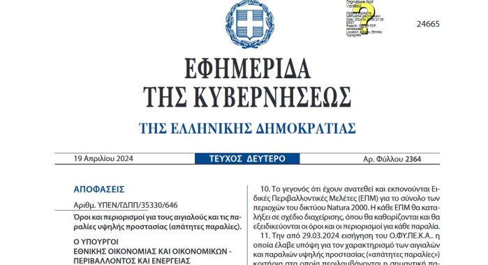 ΥΠΕΝ/ΓΔΠΠ/35330/646/02.04.2024 (Β΄ 2364) Όροι και περιορισμοί για τους αιγιαλούς και τις παραλίες υψηλής προστασίας (απάτητες παραλίες).