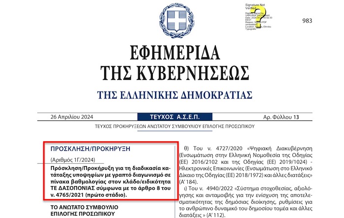 Δημοσιεύτηκε το ΦΕΚ με την αριθμ. 1Γ/2024 Πρόσκληση/Προκήρυξη του ΑΣΕΠ για τη διαδικασία κατάταξης υποψηφίων με γραπτό διαγωνισμό σε πίνακα βαθμολογίας στον κλάδο/ειδικότητα ΤΕ ΔΑΣΟΠΟΝΙΑΣ.