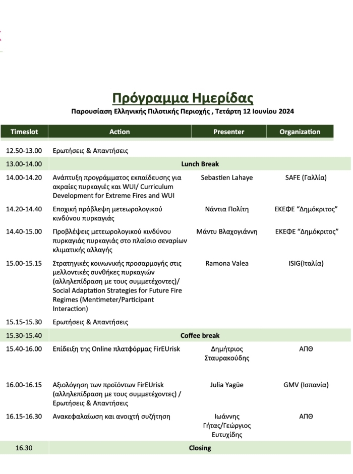 Ο Δήμος Ραφήνας-Πικερμίου και το Εργαστήριο Δασικής Διαχειριστικής και Τηλεπισκόπησης του Τμήματος Δασολογίας και Φυσικού Περιβάλλοντος του Αριστοτέλειου Πανεπιστημίου Θεσσαλονίκης (ΑΠΘ), διοργανώνουν υβριδική, δίγλωσση ημερίδα με τίτλο “Ανάπτυξη μιας ολιστικής στρατηγικής διαχείρισης κινδύνων για τις πυρκαγιές στην Ευρώπη“. Η ημερίδα υλοποιείται στο πλαίσιο Ευρωπαϊκού ερευνητικού έργου FirEUrisk και θα πραγματοποιηθεί στις 12 Ιουνίου 2024 στο ξενοδοχείο “Αύρα” στη Ραφήνα.