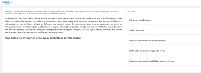 Επομένως, η επιλογή «Κανένα από αυτά» δεν μπορεί να είναι σωστή. Αναφορικά με τις υπόλοιπες εναλλακτικές απαντήσεις, αυτές δεν αφορούν σε οφέλη για την ψυχική υγεία. Επιπλέον, δεν γίνεται κάποια αναφορά στο κείμενο σε «Αυξημένο μεταβολισμό», ούτε και σε «Λεπτή μέση». Επομένως, οι απαντήσεις αυτές δεν είναι σωστές, βάσει των πληροφοριών που παρέχονται στο κείμενο.