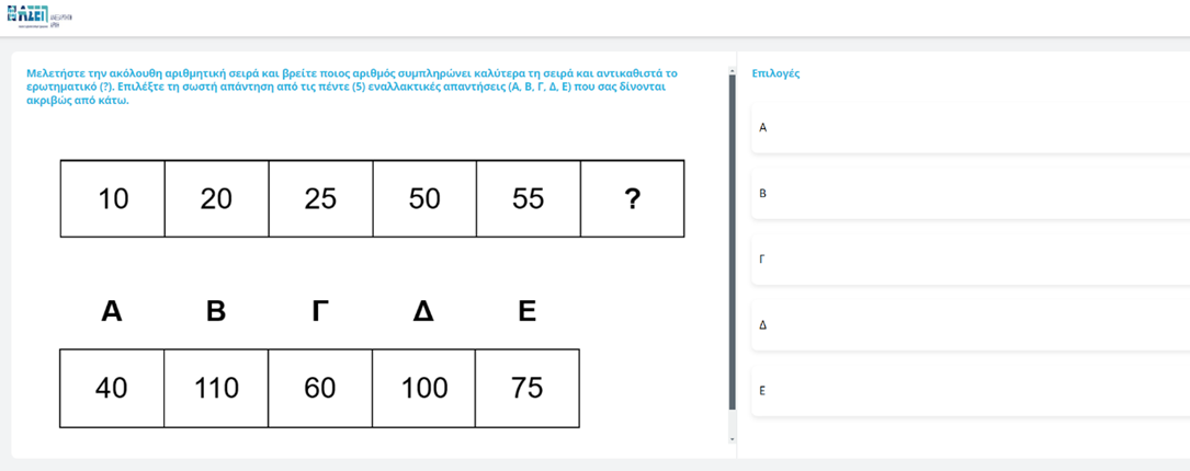 Αυτό το είδος ερωτημάτων αφορά στην αναγνώριση των σχέσεων μεταξύ αριθμών που εμφανίζονται σε μία σειρά. Σε κάθε ερώτηση πρέπει να βρίσκετε ποιος αριθμός συμπληρώνει ορθά τη σειρά και αντικαθιστά το ερωτηματικό (?). Εντοπίστε τη σωστή απάντηση από τις πέντε (5) εναλλακτικές απαντήσεις που θα σας δίνονται ακριβώς από κάτω και υποδείξετε την απάντησή σας επιλέγοντας το αντίστοιχο γράμμα Α, Β, Γ, Δ, ή Ε.