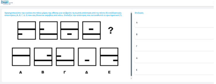 Η θέση από την οποία θα λείπει κάθε φορά το σχήμα, θα υποδεικνύεται με ένα ερωτηματικό (?). Επιλέξτε την απάντηση που αντικαθιστά το ερωτηματικό από τις πέντε (5) εναλλακτικές απαντήσεις και υποδείξετε την απάντησή σας επιλέγοντας το αντίστοιχο γράμμα Α, Β, Γ, Δ, ή Ε.