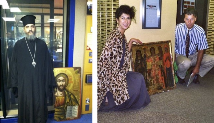 [157] Η Τασούλα Χατζητοφή είναι Κύπρια πολιτιστική ακτιβίστρια και συγγραφέας, με καταγωγή από την Αμμόχωστο. Χάρη στις ακούραστες, γενναίες προσπάθειές της έχουν επαναπατριστεί έως σήμερα στην Κύπρο πολύ σημαντικά θρησκευτικά κειμήλια που εκλάπησαν και πωλήθηκαν στο εξωτερικό από Τούρκους αρχαιοκαπήλους και λαθρεμπόρους μετά την εισβολή το 1974. Με την συντονισμένη εργασία της, την ξεχωριστή τόλμη και την επιμονή της οδήγησε, μεταξύ άλλων, στη σύλληψη του αρχαιοκαπήλου Αϊντίν Ντικμέν και στην ανάκτηση εκατοντάδων έργων που είχε στην κατοχή του από λεηλατημένους θρησκευτικούς θησαυρούς της βόρειας Κύπρου. Στη φωτογραφία διακρίνεται η κα Χατζητοφή, το 1995, οπότε χάρη στις ενέργειές της επαναπατρίστηκε η ιερά εικόνα του Αρχαγγέλου Μιχαήλ που είχε κλαπεί από Τούρκους αρχαιοκαπήλους και πωληθεί στην Ολλανδία, από τον ιερό ναό του Ευαγγελιστού Ιωάννου Πλατανιστάσας. Μολονότι η εκκλησία αυτή δεν εμπίπτει στα κατεχόμενα, η συγκεκριμένη εικόνα τις ημέρες της τουρκικής εισβολής το 1974, είχε προσωρινά παραχωρηθεί για προσκύνημα στην Επισκοπή Κερύνειας, απ’ όπου αφαιρέθηκε κατά την εισβολή και επωλήθη παράνομα σε συλλέκτη του εξωτερικού (βλ. http://www.tasoulahadjitofi.com/cases/, βλ. και «Η Κύπρια ακτιβίστρια Τασούλα Χατζητοφή παρουσιάζει το αυτοβιογραφικό της βιβλίο», σε: https://www.kathimerini.com.cy/. Σχετ. βλ. και: Τασούλα Χατζητοφή, «Η Κυνηγός Εικόνων», εκδ. Λιβάνη, Λεμεσός 2020.