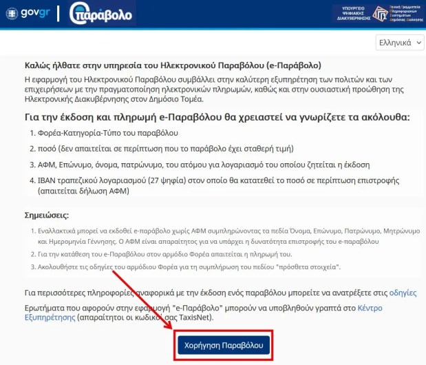 Από την εφαρμογή e–paravolo δίνονται οδηγίες για τα διαδοχικά στάδια της έκδοσης του ηλεκτρονικού παραβόλου και για τη συμπλήρωση των απαραίτητων στοιχείων του πολίτη.