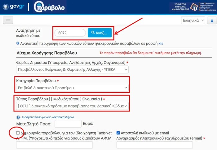 (Εικ. 3. Παράδειγμα αναζήτησης για τον κωδικό παραβόλου 6072 που αφορά “Διοικητικό πρόστιμο παραβίασης του Δασικού Κώδικα”)