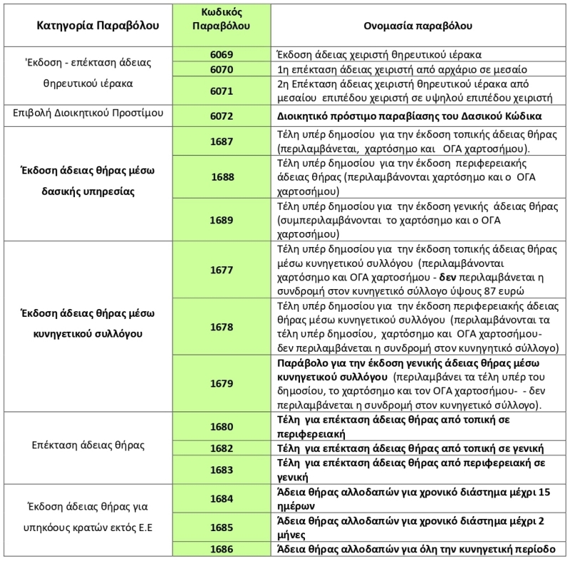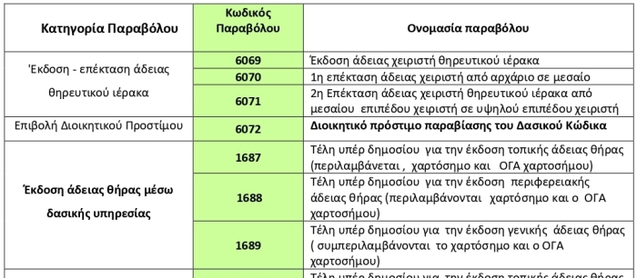 Έχουν ενεργοποιηθεί στην εφαρμογή e–paravolo και μπορεί να χρησιμοποιηθούν και τη φετινή χρονιά τα ηλεκτρονικά παράβολα για την έκδοση αδειών θήρας ή και την επέκτασή τους αλλά και για την καταβολή των προστίμων που προβλέπονται στο Δασικό Κώδικα, τα οποία, ο κάθε ενδιαφερόμενος πολίτης με απλά και εύκολα βήματα μπορεί να συμπληρώσει και στη συνέχεια να τα πληρώσει μέσω της τράπεζας με την οποία συνεργάζεται ή και ηλεκτρονικά μέσω internet banking.