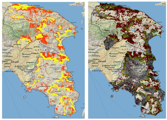 Εικόνα 2. Χάρτης μεικτών περιοχών στην Αττική: Αριστερά χάρτης με Ζώνες μείξης (κόκκινο) και Ζώνες επαφής (κίτρινο) & κατανομή κτιρίων (δεξιά)