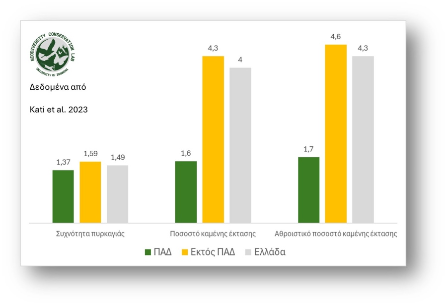 στις δασικές εκτάσεις που δεν έχουν δρόμους, δηλαδή εμπίπτουν σε Περιοχές Άνευ Δρόμων (ΠΑΔ) και εκτός αυτών, δηλαδή στις δασικές εκτάσεις με οδικό δίκτυο. Βρήκαμε πως καίγονται πολύ λιγότερο: το ποσοστό των καμένων δασικών εκτάσεων ανά 100 τ.χλμ. ήταν 2.7 φορές μικρότερο εντός ΠΑΔ από ότι εκτός. Η συχνότητα εκδήλωσης της πυρκαγιάς (αριθμός πυρκαγιών ανά 100 τ.χλμ) ήταν επίσης μικρότερη στις δασικές εκτάσεις εντός των ΠΑΔ [14]. Επομένως, έχουμε μια πρώτη ένδειξη πως νέοι δρόμοι στις ΠΑΔ μάλλον θα αυξήσουν τις δασικές πυρκαγιές στις πιο οικολογικά πολύτιμες και σημαντικές άγριες φυσικές περιοχές της χώρας. Περισσότερη έρευνα απαιτείται για την επιβεβαίωση του προτύπου με χρήση πολυπαραγοντικών μοντέλων.