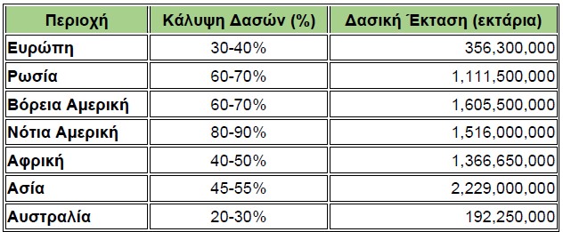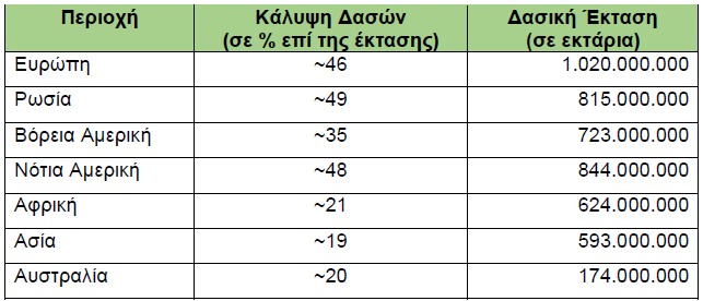 Συνοπτικά στον πίνακα 5 παρατηρούμε την κάλυψη των δασών σε ποσοστό και σε εκτάρια κάθε Ηπείρου της γης κατά την περίοδο του 20ου Αιώνα.