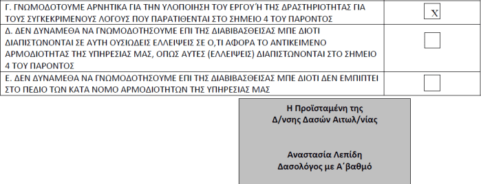 Κυρίως όμως μέσα από την στάση της αυτή στο εξεταζόμενο έργο, η Δασική υπηρεσία, με τους άξιους επιστήμονες λειτουργούς της, απέδειξε ότι μπορεί και ξέρει πολύ καλά να αφουγκράζεται τον άνθρωπο της υπαίθρου με όλες τις αγωνίες και τα προβλήματά του και να στέκεται με θάρρος και λόγο ελεύθερο απέναντι στους χαλεπούς για την ελληνική φύση καιρούς μας, στο πλάι κάθε ανθρώπου που δίνει μόνος του, με ένα τρομακτικό προσωπικό και οικονομικό κόστος, τον μεγάλο αγώνα της εποχής μας ενάντια στα θηρία της ενέργειας και της αλαζονικής διακυβέρνησης.