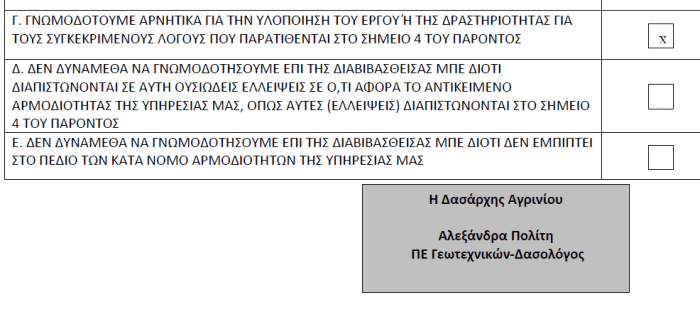 Κυρίως όμως μέσα από την στάση της αυτή στο εξεταζόμενο έργο, η Δασική υπηρεσία, με τους άξιους επιστήμονες λειτουργούς της, απέδειξε ότι μπορεί και ξέρει πολύ καλά να αφουγκράζεται τον άνθρωπο της υπαίθρου με όλες τις αγωνίες και τα προβλήματά του και να στέκεται με θάρρος και λόγο ελεύθερο απέναντι στους χαλεπούς για την ελληνική φύση καιρούς μας, στο πλάι κάθε ανθρώπου που δίνει μόνος του, με ένα τρομακτικό προσωπικό και οικονομικό κόστος, τον μεγάλο αγώνα της εποχής μας ενάντια στα θηρία της ενέργειας και της αλαζονικής διακυβέρνησης.