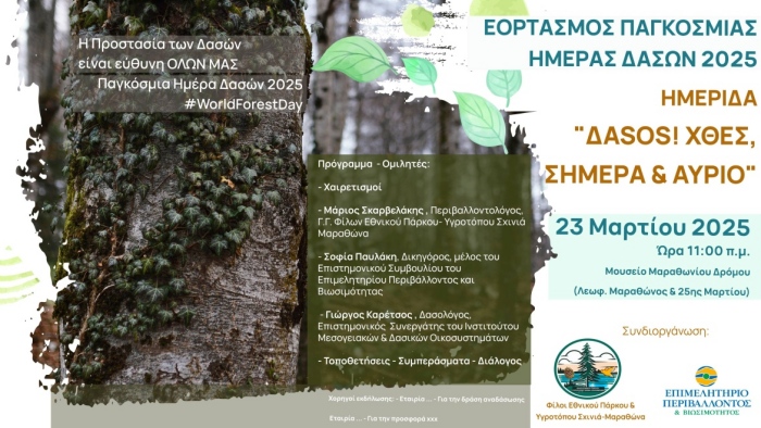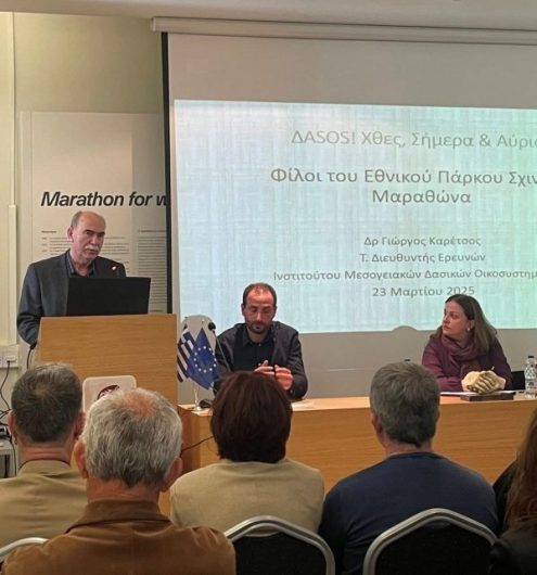 Εισήγηση στο πλαίσιο επιστημονικής Ημερίδας που διοργάνωσαν οι «Φίλοι του Εθνικού Πάρκου & Υγροτόπου Σχινιά – Μαραθώνα» σε συνεργασία με το «Επιμελητήριο Περιβάλλοντος & Βιωσιμότητας» στις 23 Μαρτίου 2025, στο Μουσείο Μαραθωνίου Δρόμου, με αφορμή την Παγκόσμια Ημέρα Δασών 2025.