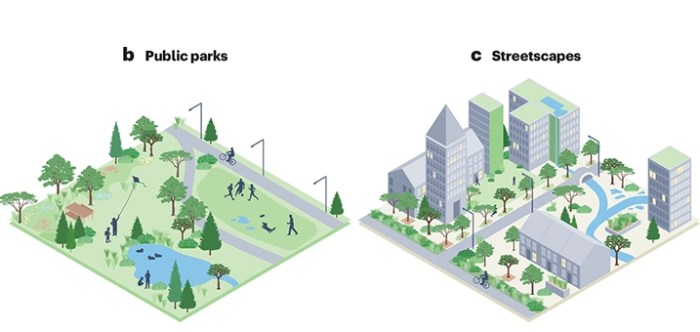 * Οι λεγόμενοι «πράσινοι και γαλάζιοι χώροι» περιλαμβάνουν πάρκα, άλση, κήπους, ποτάμια, λίμνες και άλλα φυσικά στοιχεία μέσα στις πόλεις, που φιλοξενούν βιοποικιλότητα και προσφέρουν ανάσα δροσιάς και επαφής με τη φύση στους κατοίκους.