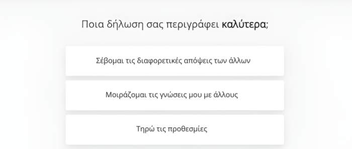 Θα παρουσιαστούν εβδομήντα έξι (76) τριάδες συμπεριφορικών δηλώσεων και οι υποψήφιοι θα κληθούν να επιλέξουν για κάθε τριάδα, ποια από τις δηλώσεις τους αντιπροσωπεύει περισσότερο. Έπειτα, θα επιλέξουν ποια από τις δύο (2) δηλώσεις, που απέμειναν, τους αντιπροσωπεύει περισσότερο. Κατά αυτόν τον τρόπο οι υποψήφιοι θα κληθούν να ιεραρχήσουν την κάθε τριάδα δηλώσεων με βάση το πόσο αντιπροσωπευτική είναι για εκείνους. Σε αυτό το είδος ερωτηματολογίων δεν υπάρχουν σωστές ή λανθασμένες απαντήσεις. Ωστόσο, από τον τρόπο ιεράρχησης και των εβδομήντα έξι (76) τριάδων δηλώσεων προκύπτει η διακρίβωση των εννέα (9) ως άνω δεξιοτήτων του Ενιαίου Πλαισίου Δεξιοτήτων, καθώς και συγκεκριμένη βαθμολογία για κάθε μία από αυτές, η οποία υποδεικνύει τον βαθμό στον οποίον οι εργασιακές συμπεριφορές του υποψηφίου συνάδουν με τις εργασιακές συμπεριφορές που σχετίζονται με την κάθε δεξιότητα του Ενιαίου Πλαισίου Δεξιοτήτων. Από τον μέσο όρο των εννέα (9) αυτών επιμέρους βαθμολογιών θα προκύψει ένας συνολικός ατομικός βαθμός προσαρμογής κάθε υποψηφίου στο επιθυμητό σύνολο συμπεριφορών, που έχει οριστεί για τον Δημόσιο Τομέα.
