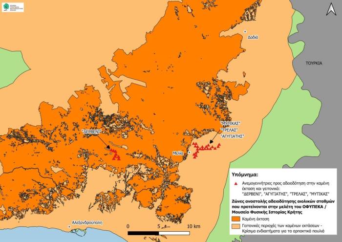 Η Αποκεντρωμένη Διοίκηση Μακεδονίας – Θράκης καλείται να αποφασίσει για την αδειοδότηση τεσσάρων Αιολικών Σταθμών μέσα στις καμένες αλλά και σε όμορες σε αυτές εκτάσεις του Έβρου. Ο ένας από αυτούς βρίσκεται εξ ολοκλήρου εντός της καμένης έκτασης της περιοχής «Νότιο Δασικό Σύμπλεγμα Έβρου», του δικτύου NATURA 2000 και μάλιστα εν μέρει εντός Ζώνης Προστασίας της Φύσης, στην οποία δεν επιτρέπεται η εγκατάσταση ανεμογεννητριών. Οι υπόλοιποι βρίσκονται σε πολύ κοντινή απόσταση (500-1.500 μέτρα) από την καμένη έκταση, μέσα σε κρίσιμα ενδιαιτήματα για τα σπάνια αρπακτικά πουλιά.