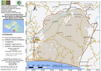 Η περιοχή απαγόρευσης της θήρας απεικονίζεται στον χάρτη προσανατολισμού κλίμακας 1:37.000 που αποτελεί αναπόσπαστο μέρος τόσο της παρούσας όσο και της αρ. πρωτ. 410325/19-08-2022 Απόφασής μας (ΔΑΔ: 02/2022) (Α.Δ.Α.: Ψ00Ψ4653Π8-ΛΧΜ) και περιγράφεται με το εξής όριο: