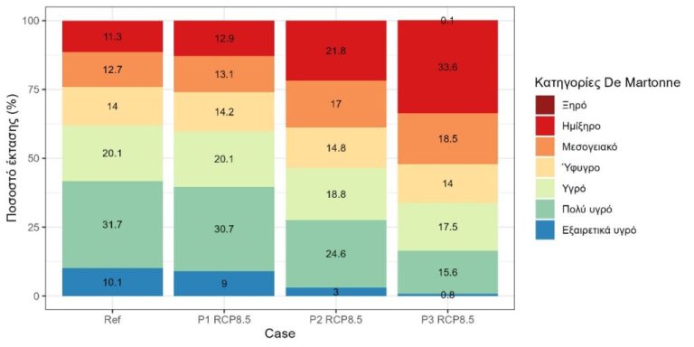 Στην Εικόνα 1 φαίνονται οι χωρικές μεταβολές των βιοκλιματικών κατηγοριών κατά De Martonne στην επικράτεια της Ελλάδας από την περίοδο αναφοράς 1980-2010 (REF) στις προβολές μέλλοντος (2011-2040 p1, 2041-2070 p2 και 2071-2100 p3), βάσει του σεναρίου εκπομπών αερίων του θερμοκηπίου RCP8.5. Η επιλογή αυτού του σεναρίου έναντι πιο μετριοπαθών, έγινε διότι τόσο οι παγκόσμιες αναπτυξιακές πρακτικές, όσο και η τρέχουσα γεωπολιτική κατάσταση φαίνεται να οδηγεί σε μια εκτεταμένη και εφαρμόσιμη συμφωνία για τη μείωση των εκπομπών αεριών του θερμοκηπίου.