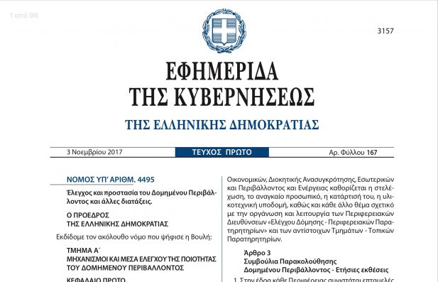 Δημοσιεύτηκε στην Εφημερίδα της Κυβερνήσεως ο νόμος 4495/2017 (Α´167) «Έλεγχος και προστασία του Δομημένου Περιβάλλοντος