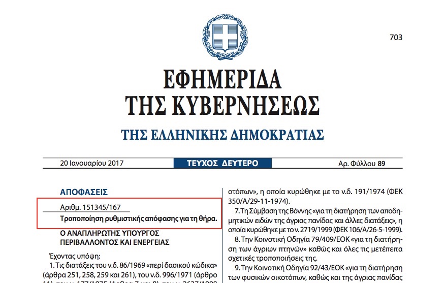 Δημοσιεύτηκε στην Εφημερίδα της Κυβερνήσεως (ΦΕΚ Β´ 89) η υπ. αριθμ. 151345/167/19-1-2017 απόφαση του αναπλ. υπουργού Περιβάλλοντος & Ενέργειας με την οποία τροποποιείται η αριθ. 143543/2140/2016 ρυθμιστική απόφαση θήρας για την κυνηγετική περίοδο 2016- 2017»