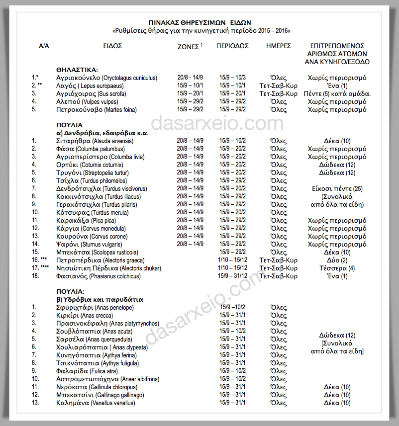 Όλες οι ρυθμίσεις θήρας της κυνηγετικής περιόδου 2015 – 2016